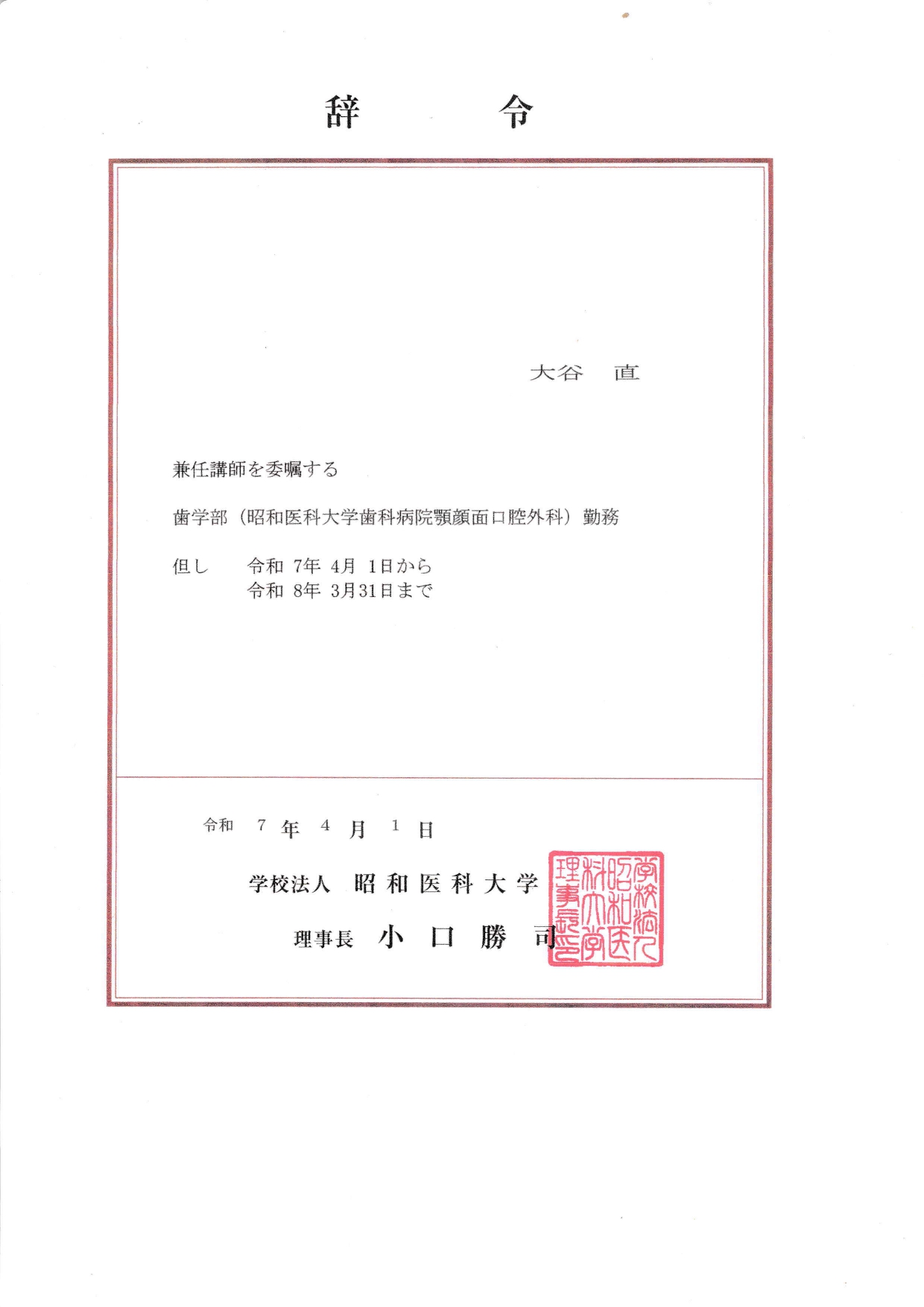 詳細:昭和医科大学歯科病院顎顔面口腔外科兼任講師令和7年度辞令